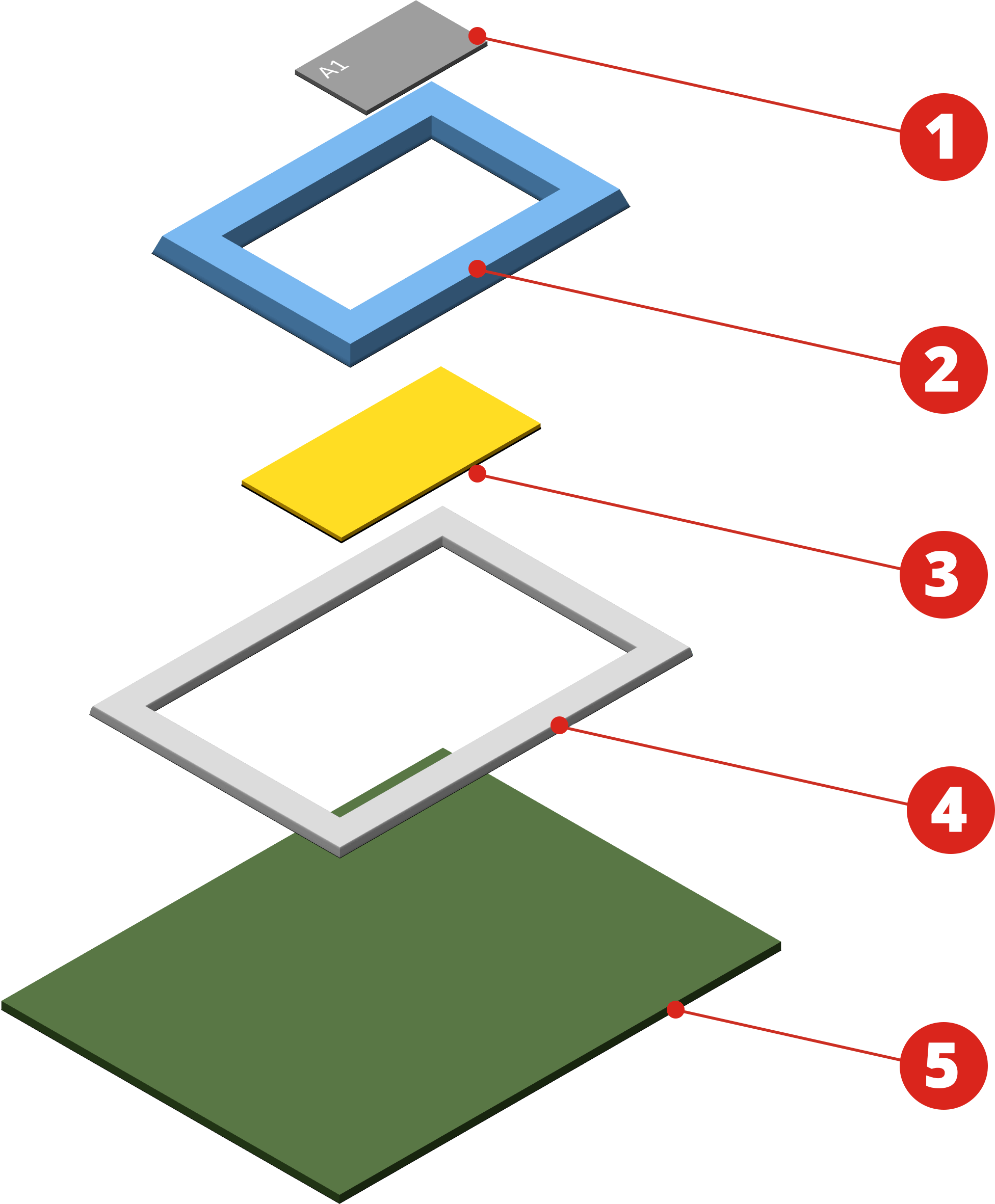 ➊ Device ➋ Guide Plate ➌ PSR ➍ Frame ➎ Test Board